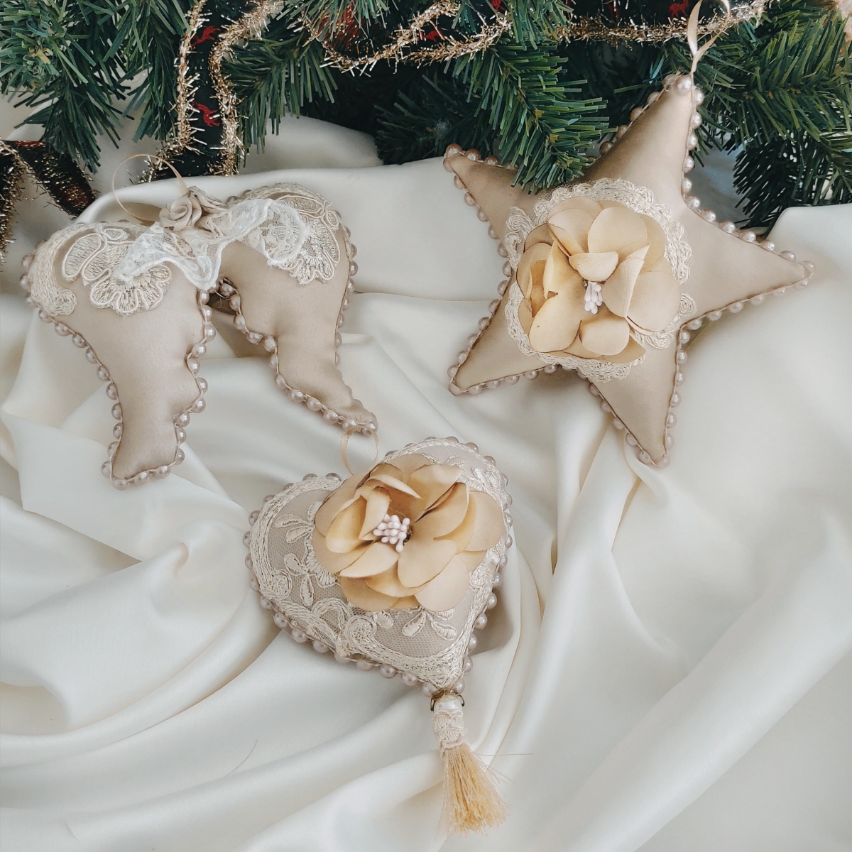 Fiecare decorațiune este confecționată cu pasiune și creativitate, folosind cele mai bune materiale. Taftaua in nuante de auriu glamour conferă un aspect elegant și sofisticat, iar pietrele și pasmanteriile fine adaugă un plus de strălucire și eleganță, sunt unice și deosebite, perfecte pentru a aduce un plus de frumusețe în casa dvs. Sunt realizate 100% manual, cu multă atenție la detalii. Iar dacă doriți să oferiți cadouri cu adevărat speciale celor dragi, atunci ar trebui să luați în considerare aceste seturi.